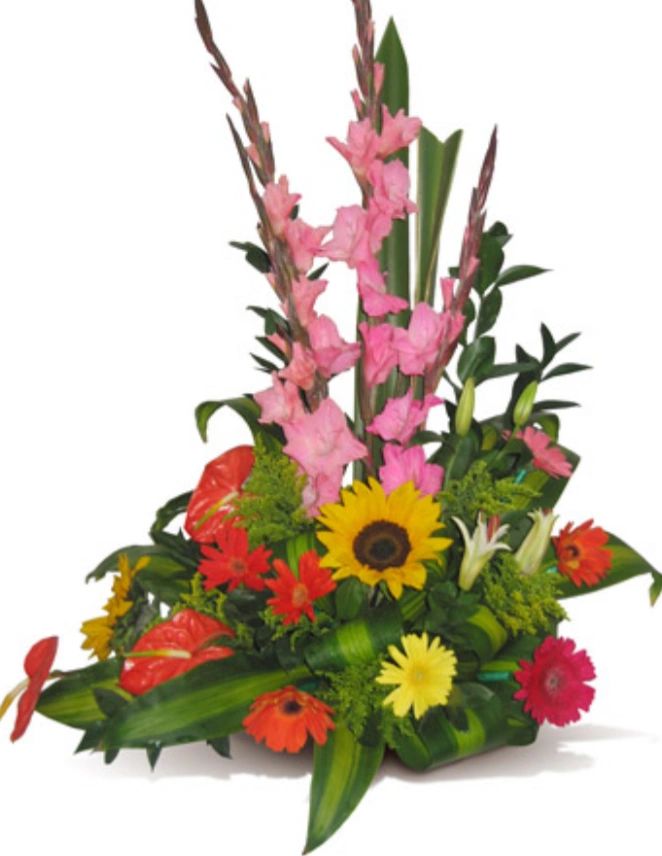 Contiene: 2 liros, 3 gladiolos, 3 anturios, 4 gerberas de color naranja, una gerbera amarilla, una gerbera roja, una gerbera rosada, 2 girasoles y hojas de dracena.